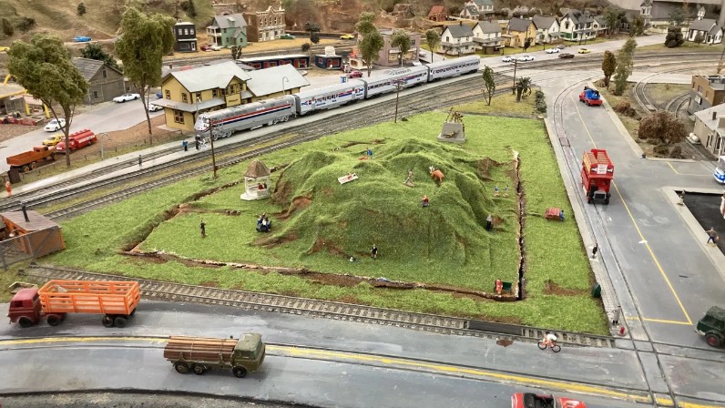 This used to be -- and is still -- an access hatch. I cut a piece of plywood a while ago of the right size, and Orion designed and added scenery to be easy to lift and move away as needed. He made the hill out of paper with a cloth surface, then painted, with grass and details glued in place.