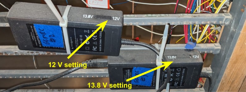After noticing that one of the NCE boosters had a different output voltage, I double checked the setup. We do indeed use NCE PB5 boosters, and their power brick has a switch for 12 V (N scale) or 13.8 V (HO scale). One of them was incorrectly set on 12 V.