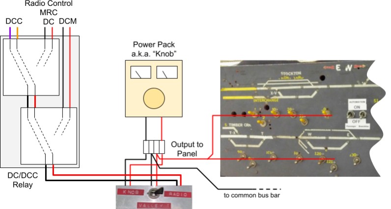 The summary here is that “knob” means DC power comes from a local custom-made power pack, which I had since removed. And “radio” means the old-style MRC walkaround radio throttles, nothing to do with today’s wireless NCE cabs. (And yes, I do enjoy drawing these schemas, I’ll admit to that.)