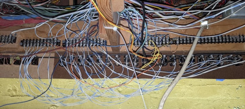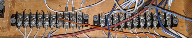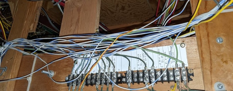 We need to keep in mind that the numbers are inverted with regards to the toggle panel. On the very right side, the big white-with-black wire is likely a ground. Then the one next to it goes to panel toggle #29. From this, it looks like we only have 12 outgoing circuits. That more or less matches the bundles of wires I’ve seen going out towards Fairfield (about 10) and towards the Roundhouse (about 3, including ground).