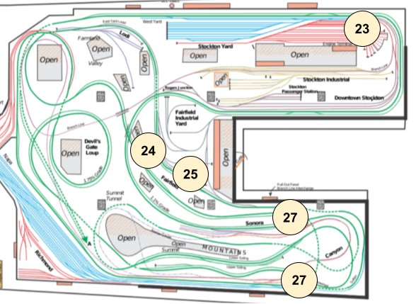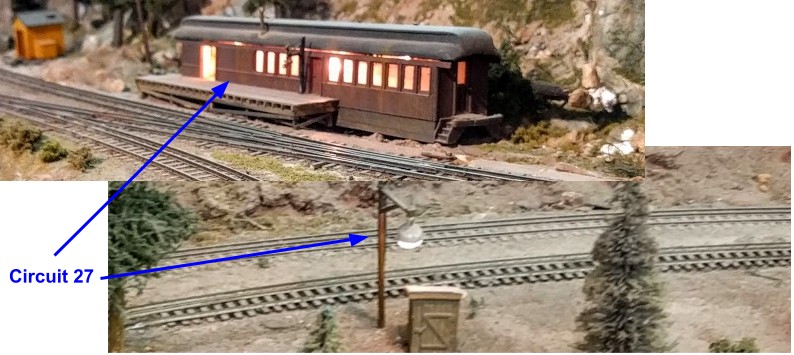 - 27 = Branchline, Sonora Street Light (by the branchline) and the illuminated car on the Branchline at Smith Flat.