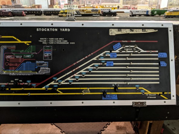 Late 2017 is when Jim and I were able to access the layout after its not-quite-2-years renovation period. First thing I did back then was try all the blocks on all the panels, itemize all the work to be done, and my philosophy is “label everything now, deal with it later”. That’s what the blue tape is for. Back in 2017-12, judging by the date written on some of the blue tape, I figured out that selecting tracks 6, 7 or 8 would simply short the yard or the mainline. Why, no idea. I was just itemizing things, not fixing them.