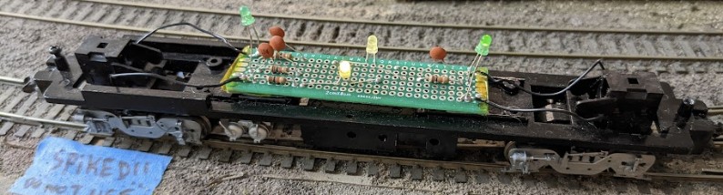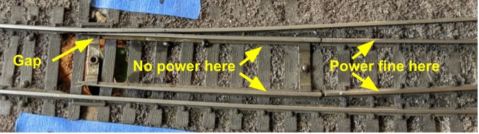 First order of business was probing the track with a multimeter, with the track power off. I was looking for a potential high resistance on the powered frog connection, and found nothing. With the track power back on, I carefully checked the track voltage, and then ran the Dead Spot Detection Car looking for dead spots. It was actually subtle yet I finally found one after many many attempts: