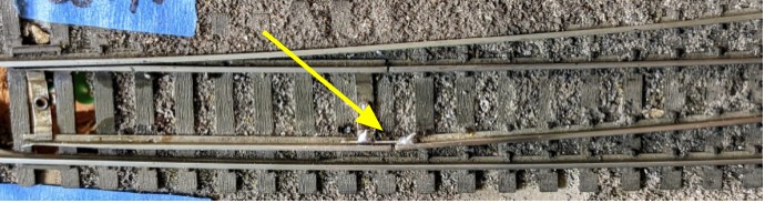 I had noticed the engines were “humping” when going on top of that frog. I carefully scraped the part between the frog and the closure rail, and it was full of that black soft material which you can see at the bottom of the image. That is typical Bright Boy material accumulated over the years. I’ve noticed the issue in several turnouts at the museum. Not only is the Bright Boy a very poor way to clean the rails, but it’s also very soft and gets stuck in turnouts and any other place where rails have sharp edges. I wished people would stop using that on the railroad.