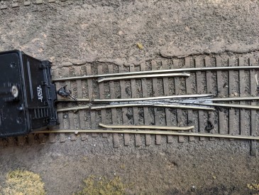 Namely, we need power to that switch rail, and I know I have power in the fixed straight and curved closure rails. Thus the “easy” solution was to bridge them to power that switch rail and the switch rod, something like this: