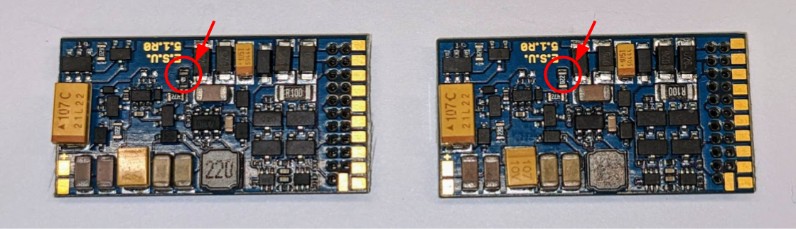 In that case, there’s a tiny 22 Ω (code 220) surface-mount resistor (just below the “E.S.U.” stencil on the board). In the failed decoder, it is charred and has obviously overheated. It is pristine in the new decoder. I do remember pointing out in my initial issue page that the hood of the engine was hot when the decoder first stopped working. Coincidence? I don’t think so.