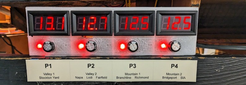 Category RandallRecently I was using a DIY “voltmeter car” to measure the NCE Boosters Voltage Levels. That’s how I found one of the boosters had the wrong voltage setting. I’m still getting sporadic reports of power loss in the mountain, and I ordered a RRampMeter to investigate this in more detail, yet in between I thought it would be nice to have an actual static display of the boosters’ voltage so I made this: