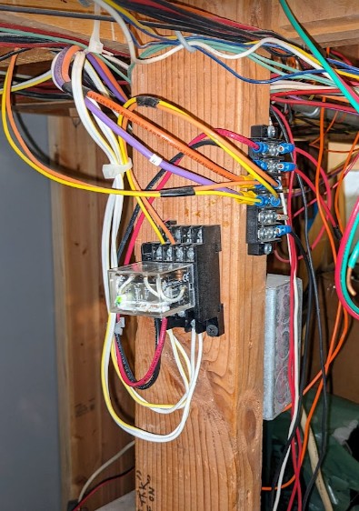 - The relay is the usual arrangement we have at the layout: it used to be a DCC-vs-DC switch, but I removed or disconnected all the DC power supplies. I kept the relay in place as it makes it trivial to isolate an entire part of the layout when working on it -- we just yank the relay out of its socket.