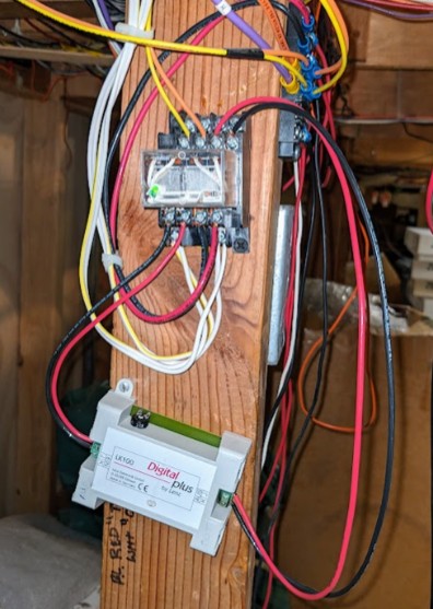- DCC bus comes in via the purple/orange wires directly from the booster / circuit breaker. This connects to the terminal block on the side of the support beam.