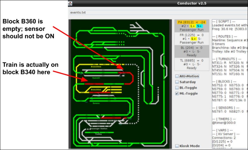 I’m kidding, I don’t expect you to understand that log. What’s interesting in this log is the line that is not there. So how about this view from Conductor 2, the software that controls the automation and monitors the track occupancy: