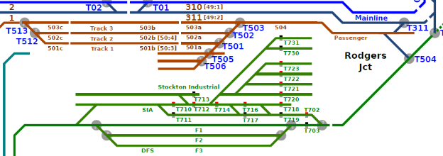 - On the Perry schematics, I noticed that tracks are labeled T3/T2/T1 as expected (with T1 being the inner one), and the top tracks are labelled GT1/2/3 -- I’m guessing for “garage tracks”. I could keep them as blocks B504..B507, or it would be worth giving them a different range of numbers >= B520 (we’re using T51x for the turnouts at the end of the station) such as B520 up to B523. See drawing above.