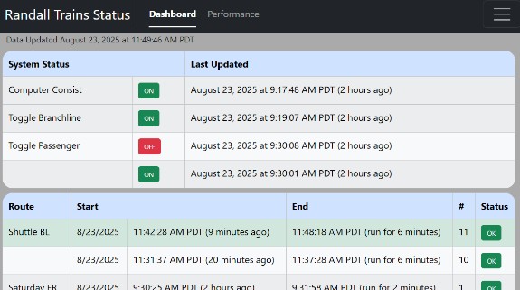 Category RandallA lot of the work I do on the layout and its automation has to do with maintenance and “invisible” infrastructure -- things people don’t see at all, but keep the entire thing running. In software development, we call these tasks “KTLO” (a.k.a. “Keep the Lights On”). Part of the invisible part of the Randall Model Railroad Automation is all my remote monitoring of the automation. I can keep track of what the trains are doing, if they are doing it properly, with notifications when things don’t run as planned, and I can (in a limited fashion) remotely operate the trains if needed.