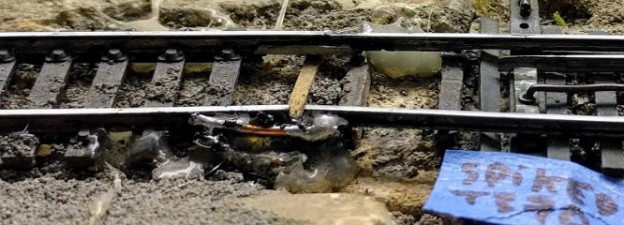 Just before turnout T370, the mainline track was of sub-par quality. There was a couple millimeter gap in the track, and it was held in place using hot glue. Once in a while we would get derailments there, and at some point we got a dead spot, and I did some repairs back in 2018.