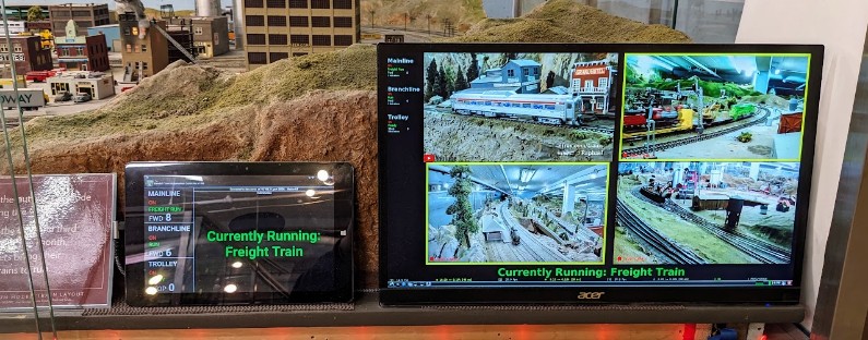 By the entrance sits the “Vision” screen -- it projects videos from a few live cameras around the layout. When there’s no train motion detected on the cameras, it displays pre-recorded videos I made on the layout -- the same ones I have on my YT channel, I have about 140 video clips now.