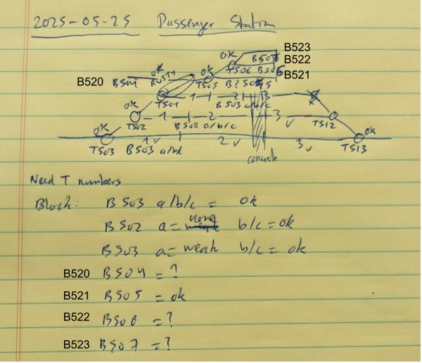 I’ve quickly checked the Stockton Station tracks: which blocks have power, which turnouts work.
