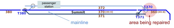 The top of the mountain is an area known as “Summit”. The mainline has two sidings around the mainline. The siding B372 has never been used and both turnouts on either side are non-functional. It now contains a little station which is where the Automation Passenger Train stops and reverses. The siding B371 used to work fine, and although it hasn’t been used in a while, we may restore it at some point.