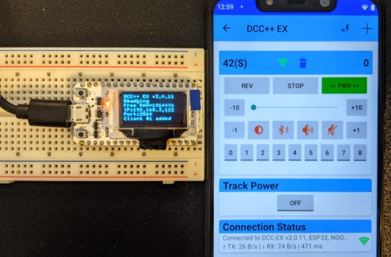On the left side, we have a “Wifi Kit 32” ESP32 running a fork of the latest DCC++ EX firmware.