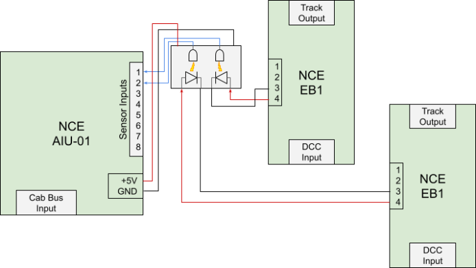 The proposed solution is to use dual-channel optocouplers to connect the EB1 LED output to the AIU inputs.