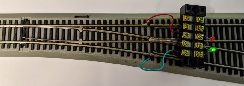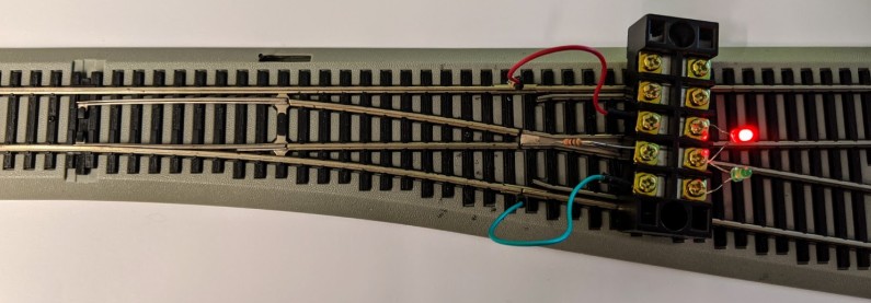 Another variation of this that I plan to use on the Randall Model Train layout is to only have the red LED, to make it clear when a turnout is left thrown/divergent. Especially for mainline turnouts, it acts as a “warning” signal. There is no need for the green LED in that case. I will likely embed the LED directly next to the turnout in the ballast. These LEDs are small enough that they could even be placed between the ties. The LED and the resistance can be wired to the existing terminal connected to the auxiliary contracts of the Tortoises.