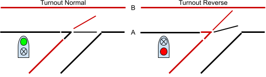 Here’s an idealized turnout, showing the polarity of the frog based on whether the turnout is normal or reverse: