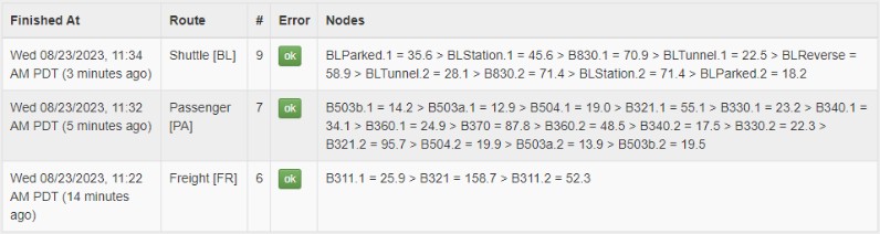 The latest change I did to Conductor 2 is to compute end-of-route statistics. Each time a route has finished, we log the time spent on each block as well as the error status of the route. This is sent to a little server over a basic JSON RPC, and in the statistics/status page we get a quick overview of the latest route -- how many times we ran that route during the day, when the last one finished, and how many seconds the train spent on each block: