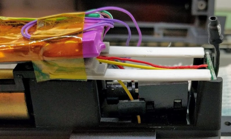 On the other side of the TSU, there are two purple wires for the speaker. A good place to put the speaker was on top of the rear truck. I created a small support with two small flat piece of plastics printed using a 3D printer (cutting a piece of styrene would work equally but I didn’t have any around). That’s the two white pieces here: