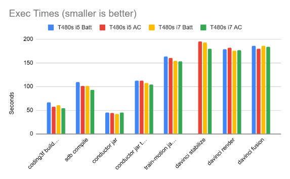 And thus, indeed, the i7 is slightly faster than the i5, and the AC mode is slightly faster than the battery mode. But how much is “slightly”?