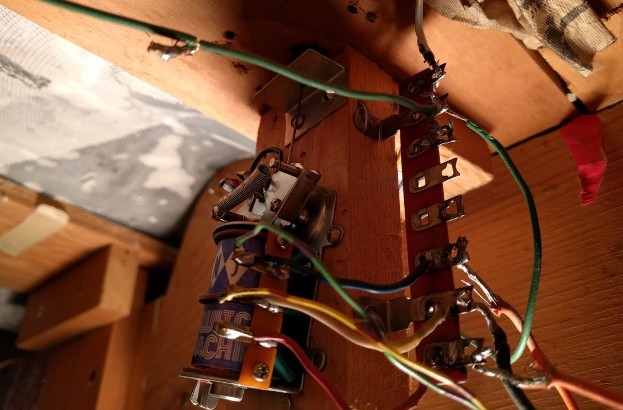 The twin-coil features a toggle which is used to invert the frog polarity. This is connected to a terminal on the right. Top 2 wires are from rail A and B. A 3rd wire under it is connected to the wrong.