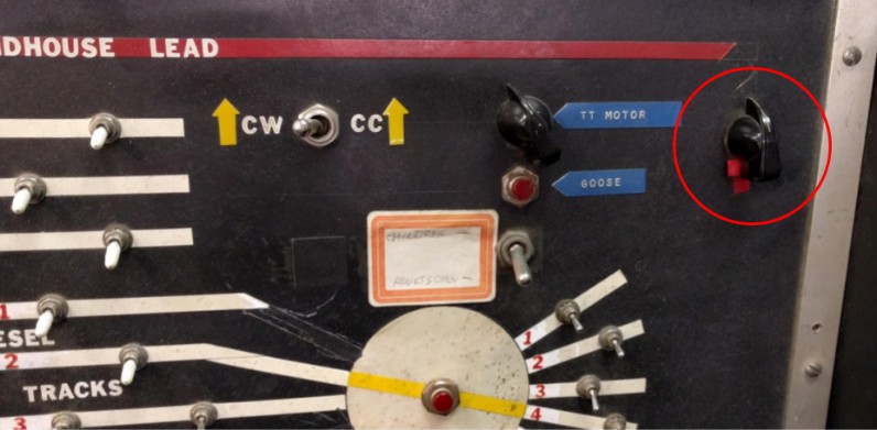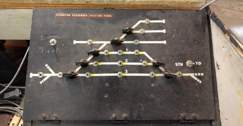 The corresponding panel for the station and its inner workings below. Each block power selector has two choices: yellow dot on the right for DCC mode and left side for DC, from what I was told. There’s no DC left on the layout so that side goes to… I don’t know where. So where does the DCC come from? Which booster? A quick test shows it comes from the Stockton Yard power district.