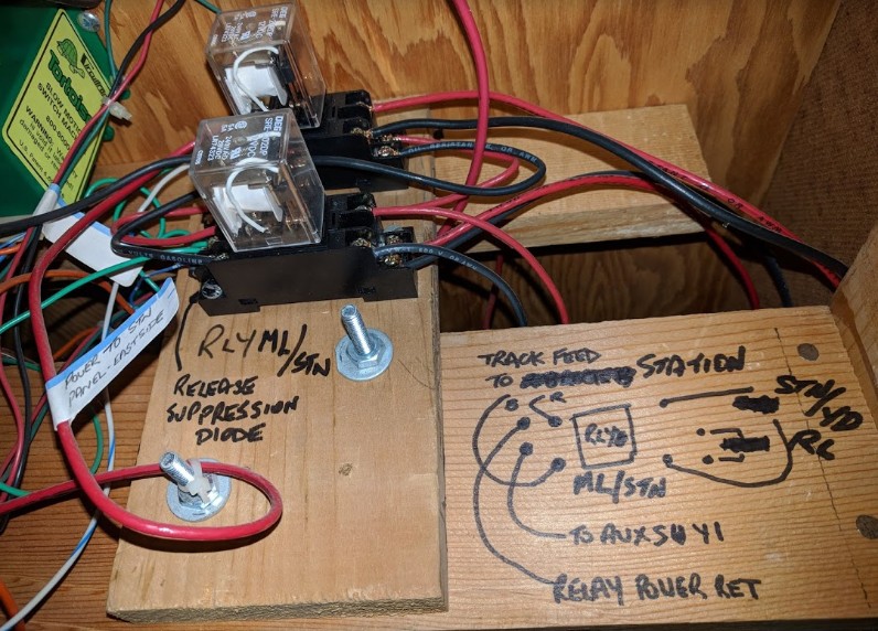 One of these relays is controlled directly or indirectly by the T03 turnout (I’m guessing actual connection is via an output of the corresponding tortoise; I was unable to actually trace that wire, yet it’s clearly labeled on the schematics I have now). In the double-relay above, one of the relays is controlled by a turnout toggle that connects the roundhouse lead to the Stockton tracks, also as indicated in the schematics: