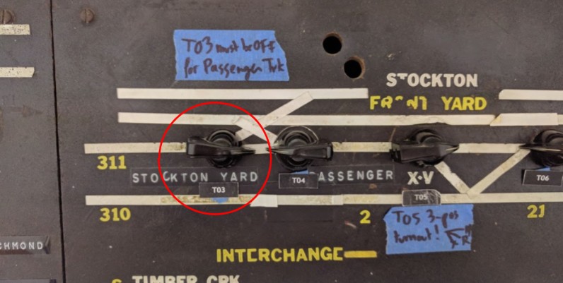 In the end, the objective is to make sure the station remained powered even when switching happens in the yard and the T03 turnout is used. The automation needs the station to be powered at all time -- otherwise the block sensors can’t identify the trains located there. Right now anyone switching in the Stockton Yard can render the automation inoperative just by setting T03 in reverse.