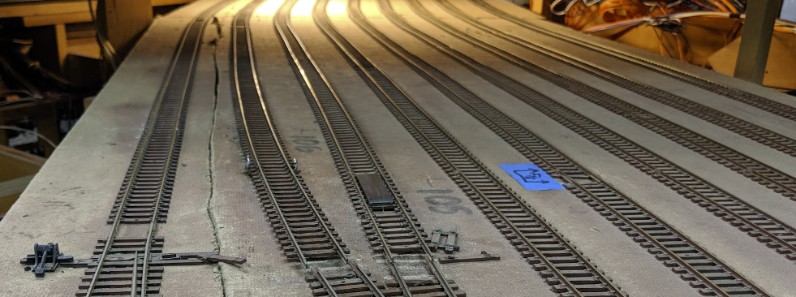 Initially I was wondering whether the issue could be to track metal expansion due to heat, or some kind of change on the part of the benchwork. I’m now tending towards the latter. I had never seen this issue before, yet given how the problem fixed itself, I’m going to guess it is not new. This is located in a basement, and we’re lucky that the temperature and humidity are generally constant pretty much all year around. We have had “weather” in this room before, including some flooding last year (about an inch of rain water in that exact spot, which got taken care of by the museum’s maintenance staff). A couple weeks before, we did have some hot weather so it’s possible the layout wood got dryer than usual for our customary oceanic foggy San Francisco weather. The benchwork there is the usual 1x4 lumber with something like ½ inch Homasote on top of it. The front panel that warped on the Stockton Yard panel looks like it’s made of some kind of fiber board.