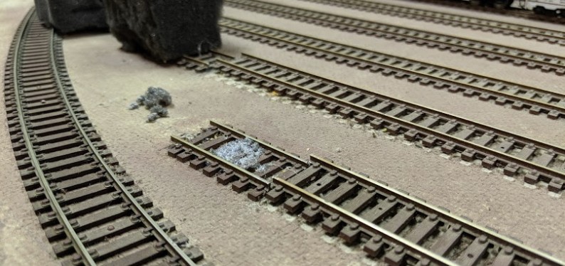 At the end of the Napa yard ladder, there are huge blocks of foam. I’m guessing to act as a nice buffer. To my surprise they also contained a big screw in them and they were glued in place with the end of the track. To make an expansion gap, the easiest thing to do is simply cut the track in front of the glued part using a rail handsaw: