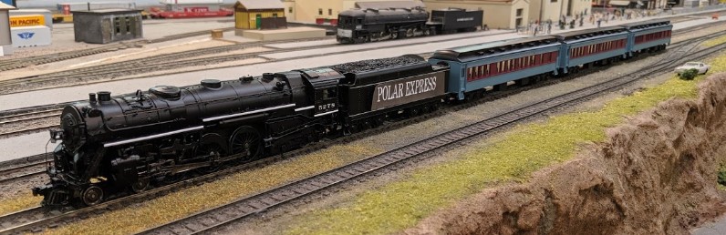 A NYC J-1 Hudson (4-6-4) pulls our Polar Express on the Automated Line on the HO Scale DCC Layout at Randall Museum, San Francisco.
