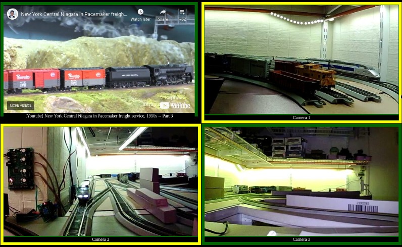 “Vision” a.k.a. Train Motion (source, MIT license) runs full screen on a laptop and plays a series of Youtube videos of the model railroad in a loop. Three cameras point to the layout and, when activity is detected on these cameras, the view changes to a matrix displaying both the Youtube video as well as the three layout cameras, showing whatever train is going by. Once the train is gone, the Youtube video plays full screen again.
