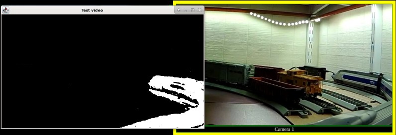 I wrote a Java-based program to handle this. Train Motion uses the FFmpeg API to fetch the cameras’ h264 feeds. OpenCV is used to do basic background subtraction using a MOG2 algorithm followed by a MedianBlur filter to remove noise. This very effectively separates the motion from the static background, as can be seen in the example output below: