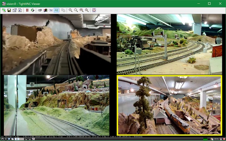 View on the Train Vision screen -- the new camera is the lower right quadrant with the yellow border showing the UP Passenger train stopped at the Summit station: