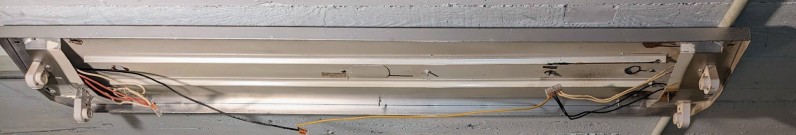 These overhead fluorescent lights fixtures are fairly simple. The cover is simply held in place with two tabs, making it easy to remove. Once we did that, we got a somewhat nasty surprise: