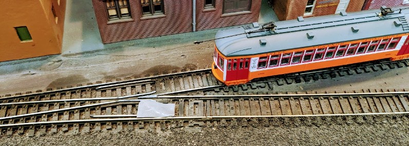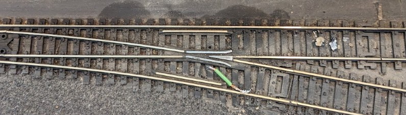I simply stuck a little wire in there and soldered it to the inside of the outer rail. It has the desired polarity for the turnout in the closed position. It’s also very easily reversible. To complete the experience, I taped a little piece of gray tape to tone down the flashy green wire I used: