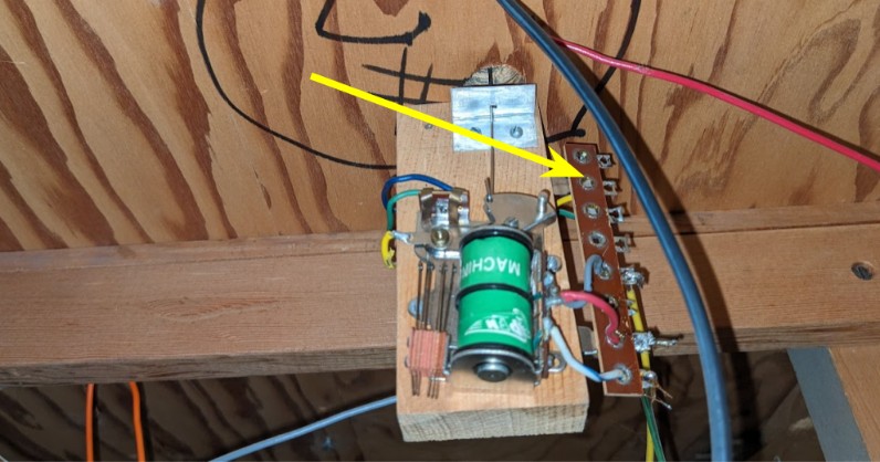 I do plan to revisit that later. I need to find the proper kind of screw or nail to fit in there. We have some of these exact same turnouts in the back so I’m going to experiment with these off-layout then I’ll be able to revisit this. Under the layout, the switch motor is one of the twin coils used everywhere on the old layout that is already almost wired for frog power routing. Green/blue is the “input” inner/outer rail power, and yellow is the “output” going to the frog.