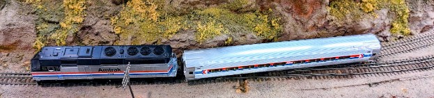 As the branchline train backs up towards Angel Camp (right), the rear truck of the lighted coach is mistakenly pulled on the diverging track and derails.