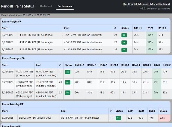 It used to be that I needed to carefully go through the automation logs to figure issues after the fact. I still expect to do that in specific situations. However, the dashboard “performance” page above should help with the most common cases by directly highlighting where a train has performed out of its expected timing range.