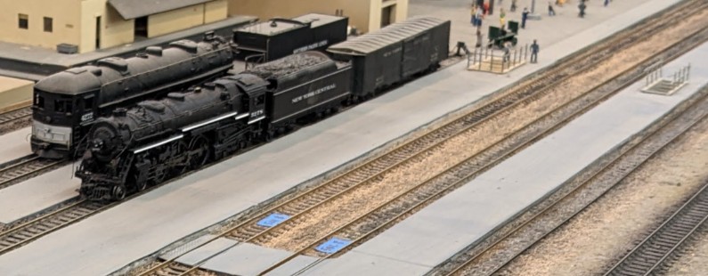 Tracks 2 and 1 were occupied by a static display of a Pennsylvania GG-1 and its passenger cars, as well as a NYC Berkshire and its NYC passenger cars. The Pennsylvania GG-1 and the PRR passenger cars have moved to the unused siding at Walong: