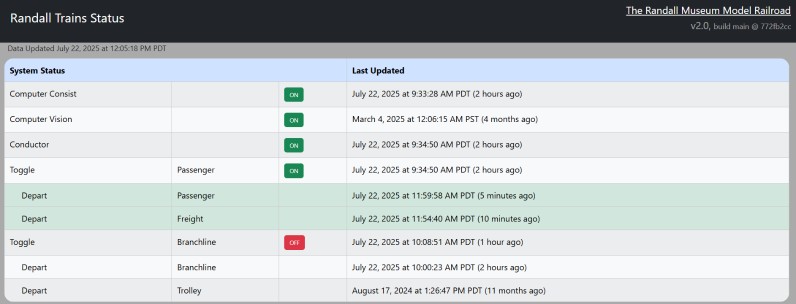 This page gives me an overview of which computers are on, wherever the automated lines are active (the “toggles”), and which train ran last, and whether it completed its run properly.