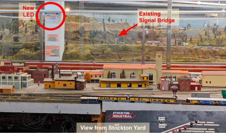Sonora has the two mainline tracks that merge together at turnout T330, and there’s a signal bridge with signals that clearly indicate the position of the turnout. The problem is that the signal bridge is not visible from across the layout, where the operators are typically standing.