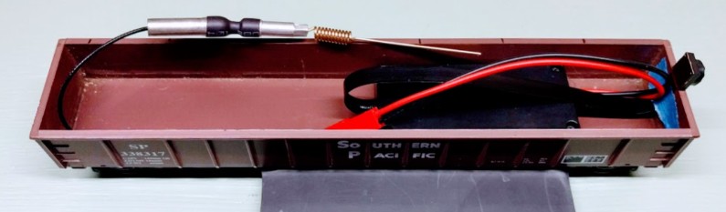 I did a quick test using a gondola car, although a boxcar may work better to hold & hide the electronics. Having the camera on a flexible ribbon connector provides a lot more flexibility in mounting locations. The body for the electronics fits very well in there, as well as the antenna.