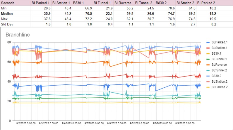 Clearly, there’s a lot of variability in the duration it takes to cross each block. A few blocks have a variation of 20 seconds between their min and their max -- B360 and B340 have a fairly high standard deviation of almost 6 seconds in their return trip. I’m not sure how I’d explain that, because these are the blocks where the train is going down the mountain.