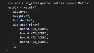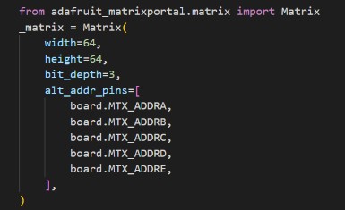 AdaFruit has a very convenient “Protomatter” library to drive these panels, and the Matrix class is initialized accordingly as such: