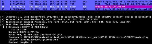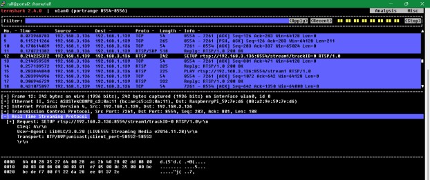 You probably can’t read the screenshot above, so let me paraphrase it: there’s a “DESCRIBE” request and the RPi cvlc server replies that the media stream is available at stream1/trackID-0. Then there’s a “SETUP” request on that, and if I zoom in on the response: