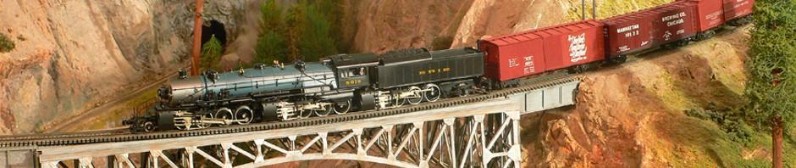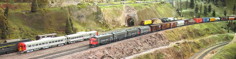 The model railroad is the result of more than fifty years’ effort to create a railroad in miniature with the communities it serves and combined with engineering and geographical features found on railroads in California. It features snow sheds on the high mountain line, various types of bridges spanning canyons on the Mountain Division and a narrow gauge line. The layout is HO scale and is contained in a room measuring 57 feet long by 38 feet wide. The mainline is about 600 feet long (nearly 10 scale miles), with an additional 200 feet or so of sidings and passing tracks (see below for the track plan).